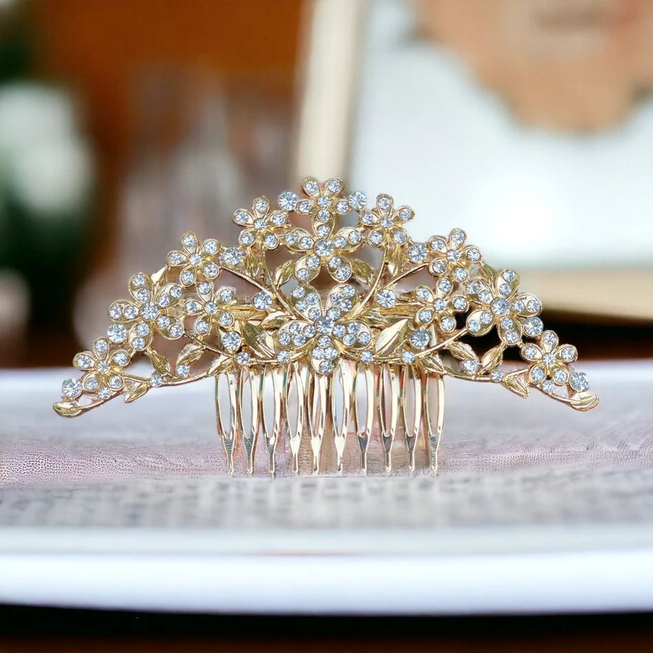 Елегантният златист гребен с кристали за коса е елегантен аксесоар, идеален за специални събития като сватба или абитуриентски бал. Той е изработен от метал в златист цвят и е инкрустиран с кристали, които придават блясък и изтънченост. Гребенът е стилен и функционален, подходящ за различни видове коса. Този аксесоар добавя допълнително блясък към всяка прическа и е перфектен завършек за официални тоалети.