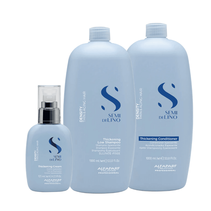 - Alfaparf SEMI DI LINO Density Thickening Low Shampoo е деликатен шампоан, специално разработен за уплътняване на тънка и изтъняваща коса, причинена от стрес, хормонални промени или прекомерна употреба на агресивни продукти. Той почиства в дълбочина, ревитализира косата и я прави по-еластична, като придава жизнен и здрав вид на изтънялите участъци. Шампоанът е подходящ както за жени, така и за мъже, осигурявайки нежно почистване и укрепване на структурата на косъма.