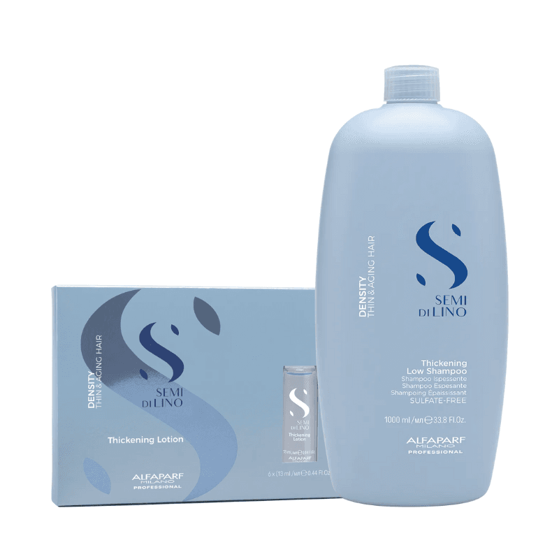 - Alfaparf SEMI DI LINO Density Thickening Low Shampoo е деликатен шампоан, специално разработен за уплътняване на тънка и изтъняваща коса, причинена от стрес, хормонални промени или прекомерна употреба на агресивни продукти. Той почиства в дълбочина, ревитализира косата и я прави по-еластична, като придава жизнен и здрав вид на изтънялите участъци. Шампоанът е подходящ както за жени, така и за мъже, осигурявайки нежно почистване и укрепване на структурата на косъма.