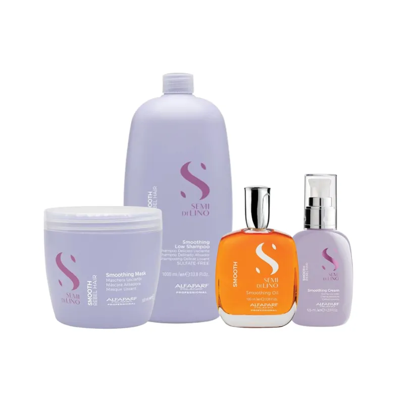 Този изглаждащ комплект от серията Alfaparf Semi Di Lino Smooth е създаден, за да дисциплинира и подреди дори най-непокорната коса, като я остави копринено мека, блестяща и лесна за оформяне. Четирите продукта работят в синхрон, осигурявайки дълбока хидратация, термозащита, устойчивост на влага и запазване на цвета.