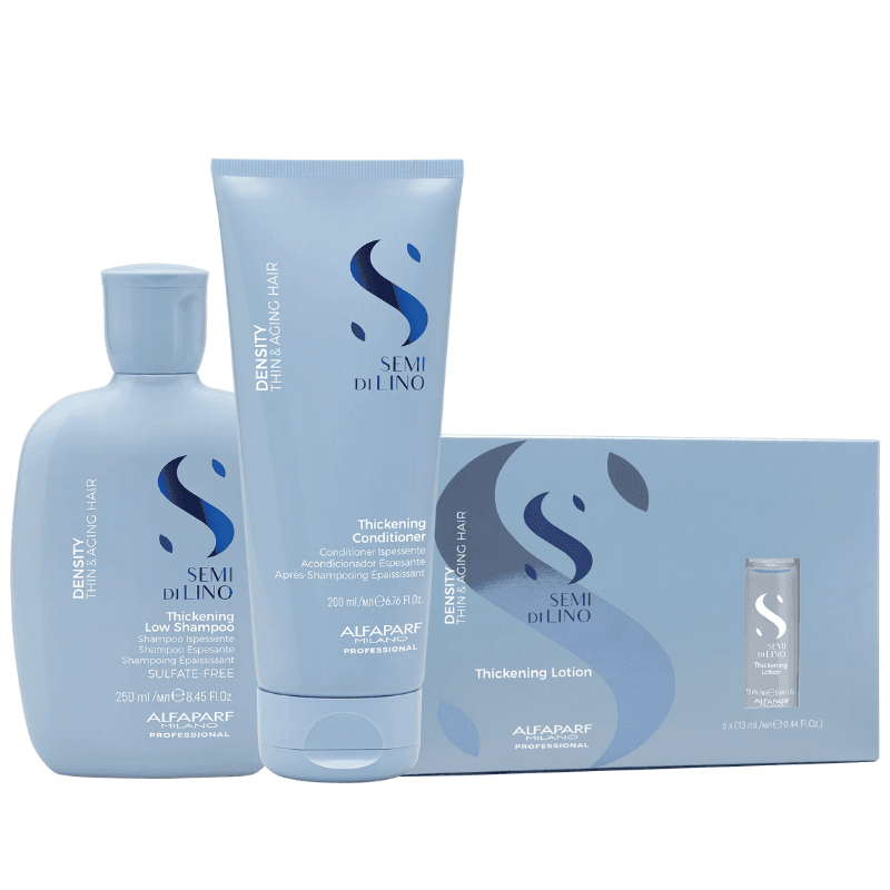 - Alfaparf SEMI DI LINO Density Thickening Low Shampoo е деликатен шампоан, специално разработен за уплътняване на тънка и изтъняваща коса, причинена от стрес, хормонални промени или прекомерна употреба на агресивни продукти. Той почиства в дълбочина, ревитализира косата и я прави по-еластична, като придава жизнен и здрав вид на изтънялите участъци. Шампоанът е подходящ както за жени, така и за мъже, осигурявайки нежно почистване и укрепване на структурата на косъма.