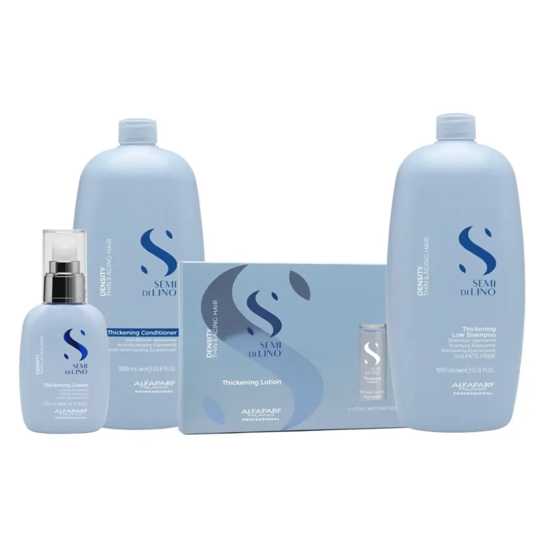 Този уплътняващ комплект от серията Alfaparf Semi Di Lino Density е специално създаден, за да вдъхне нов живот на тънката и изтъняваща коса. Четирите продукта в него работят в хармония, като укрепват косъма, увеличават плътността и придават видимо повече обем, без да утежняват. Формулите са обогатени с патентован Filler Complex, високоефективни защитаващи комплекси и растителни екстракти, които заздравяват косата от корена до върха.