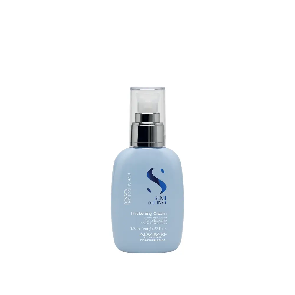 Alfaparf SEMI DI LINO Thickening Cream е специално създаден за тънка и изтъняваща коса, осигурявайки интензивно уплътняване и защита. Кремът ревитализира косата и я предпазва от вредното влияние на топлинните уреди, като запазва нейната здравина и виталност. Формулата придава плътност и обем, като омекотява косата и й придава дълготраен блясък. Подходящ е както за жени, така и за мъже, които искат да се борят с изтъняването на косата и да я направят по-плътна и жизнена.