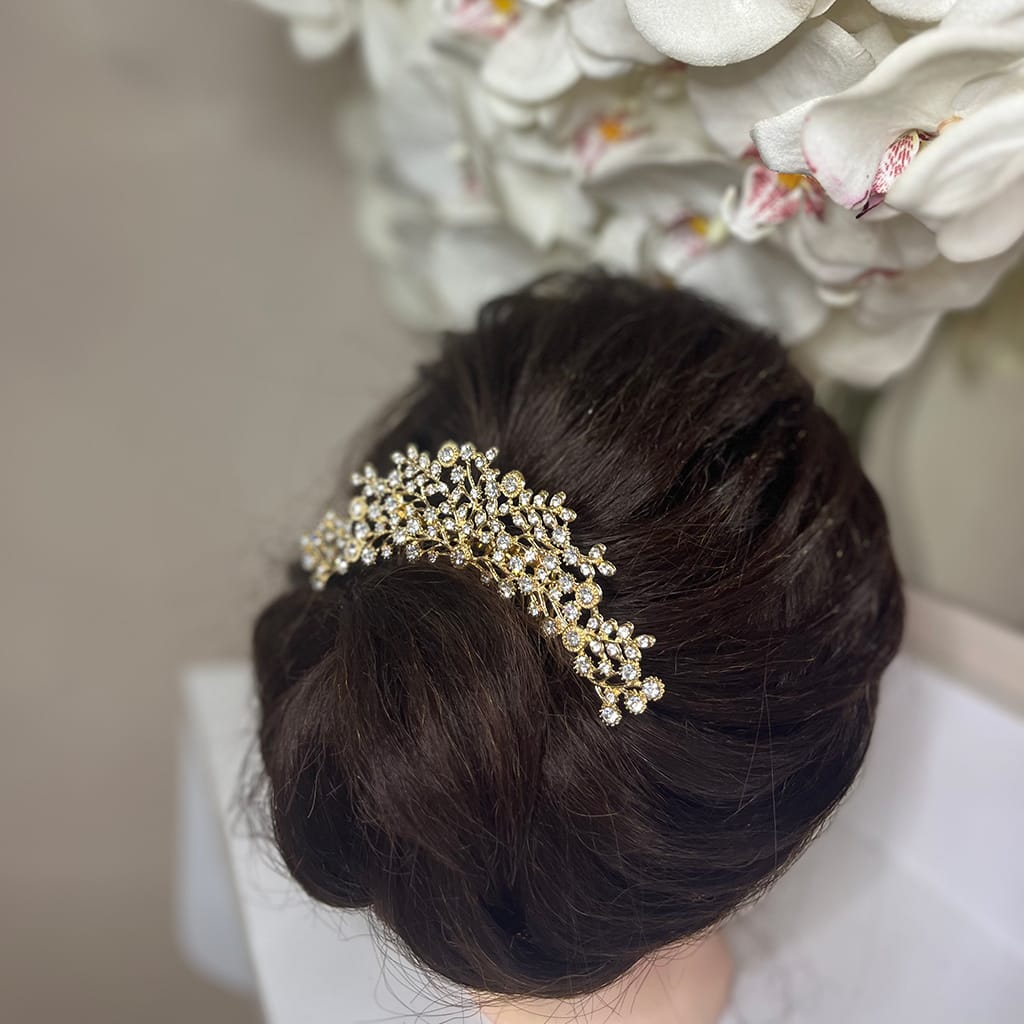 Златистият гребен с кристали за коса е елегантен аксесоар, идеален за специални събития като сватба или абитуриентски бал. Той е изработен от метал в златист цвят и е инкрустиран с кристали, които придават блясък и изтънченост. Гребенът е стилен и функционален, подходящ за различни видове коса. Този аксесоар добавя допълнително блясък към всяка прическа и е перфектен завършек за официални тоалети.